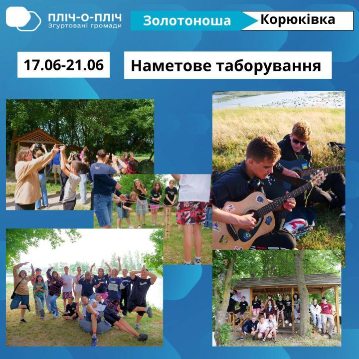 У межах Всеукраїнської програми «Пліч-о-пліч: згуртовані громади» з 17 по 21 червня на базі Золотоніської громади в селі Кропивна відбулося п’ятиденне молодіжне таборування, яке стало справжнім простором для знайомств, довіри, нових емоцій і незабутніх моментів. Разом із підлітками з нашої громади участь у таборі взяли молоді активісти з Корюківської громади (Чернігівщина, МЦ «КУБ»).