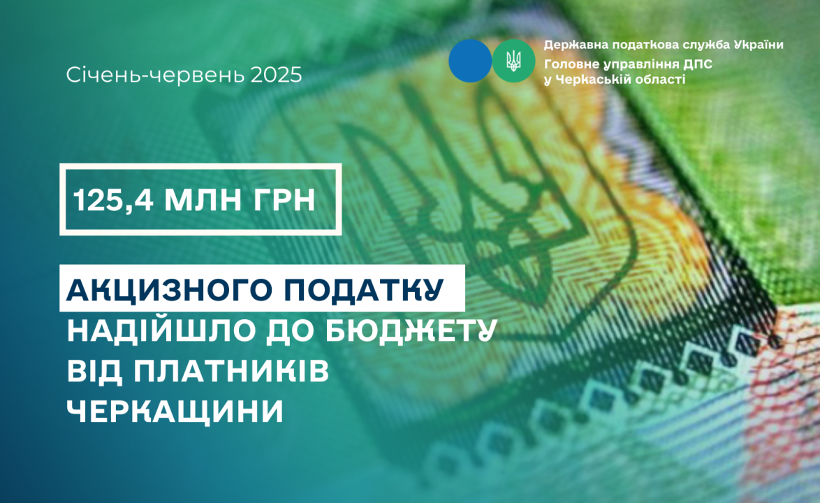 Платники податків Черкащини за січень-червень 2025 року сплатили 125,4 млн грн акцизного податку. За повідомленням начальника Головного управління ДПС у Черкаській області Тетяни Харьковської, за січень-червень до загального фонду державного бюджету платники сплатили 13,6 млн грн акцизного податку з вироблених та ввезених в Україну підакцизних товарів.