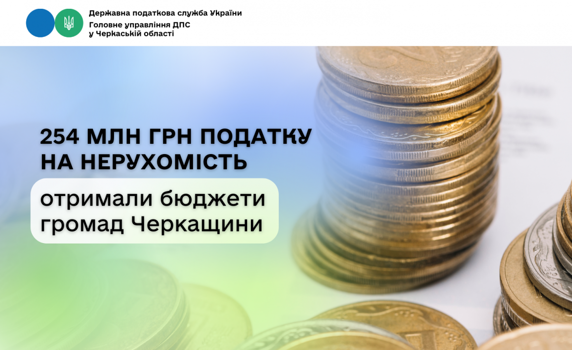 За результатами 9 місяців 2025 року місцеві бюджети Черкащини отримали 254 млн грн податку на нерухомість. Про це повідомляє начальник Головного управління ДПС у Черкаській області Тетяна Харьковська.