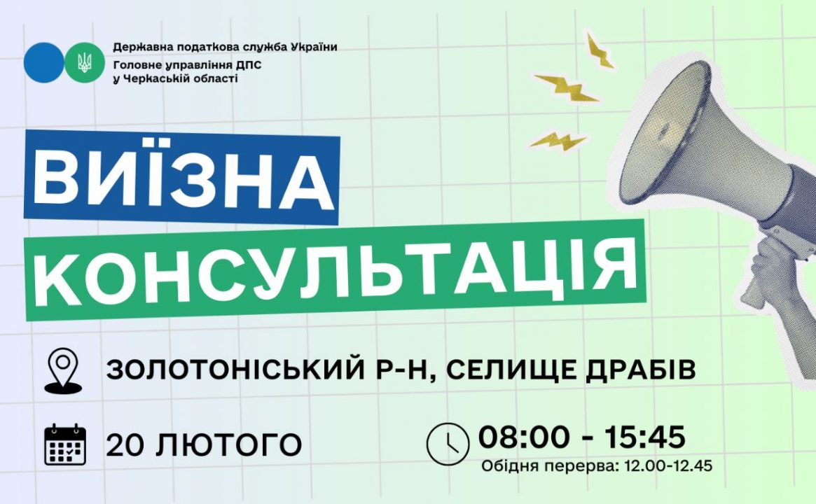 Фахівці Золотоніської ДПІ ГУ ДПС у Черкаській області проведуть виїзний прийом для платників податків Драбівської, Шрамківської та Великохутірської громад.