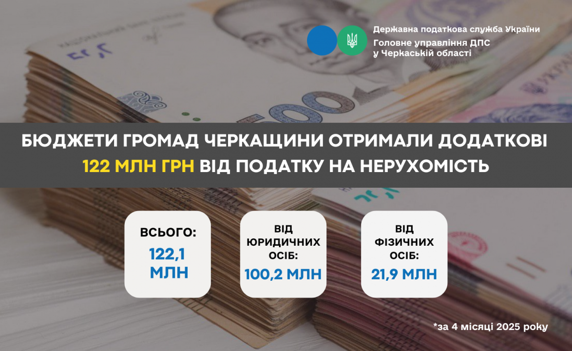 За результатами 4 місяців 2025 року місцеві бюджети області отримали 122,1 млн грн податку на нерухомість. Про це повідомляє виконуюча обов’язки начальника ГУ ДПС у Черкаській області Тетяна Харьковська.