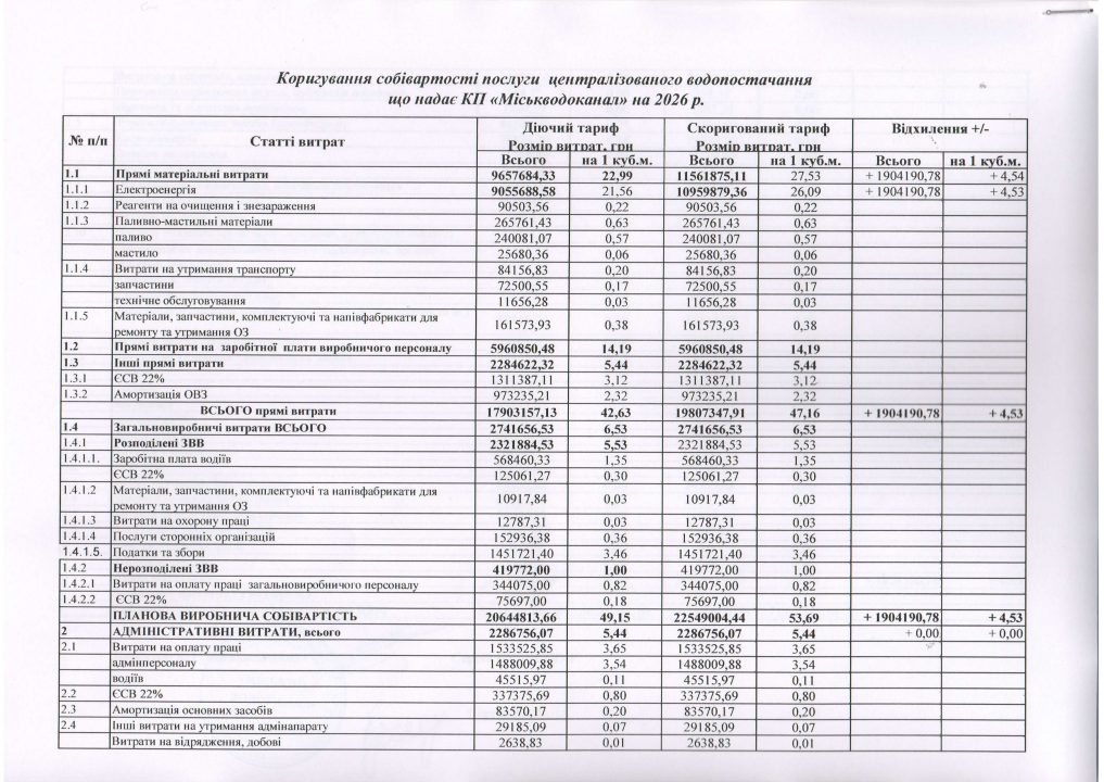 Комунальне підприємство «Міський водоканал» повідомляє про необхідність коригування діючих тарифів на послуги з централізованого водопостачання та водовідведення відповідно до фактичної вартості електроенергії. Дане рішення зумовлене потребою привести тарифи до економічно обґрунтованого рівня для забезпечення стабільної роботи підприємства в умовах воєнного стану, можливості цілодобового та безперебійного надання послуг.