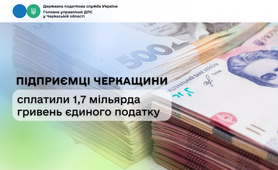 За 9 місяців 2025 року від підприємців Черкаської області до місцевих бюджетів регіону надійшло 1 мільярд 707 мільйонів гривень єдиного податку. Як зазначають в Головному управлінні ДПС у Черкаській області, сплачена сума на 173 мільйони гривень перевищила минулорічну.