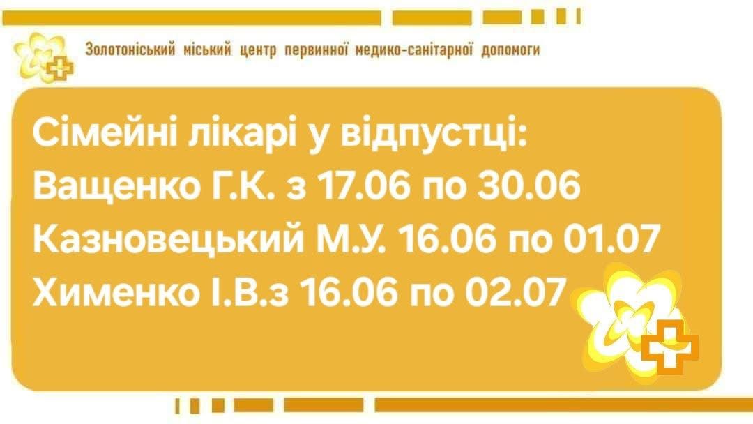 Шановні пацієнти Золотоніського міського центру ПМСД! Звертаємо вашу увагу, що із наступного тижня перелічені сімейні лікарі перебуватимуть у відпустці: