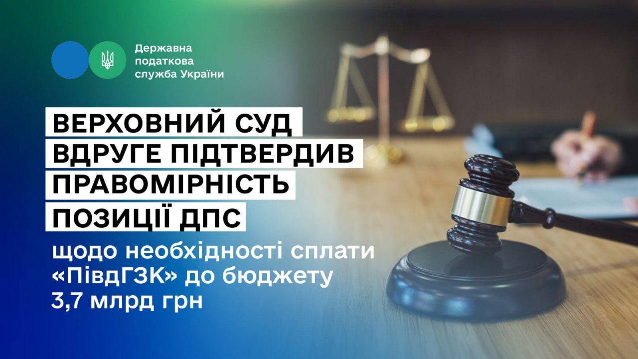 Верховний Суд вдруге підтвердив правомірність позиції Державної податкової служби України у справі щодо АТ «Південний ГЗК». Про це повідомила в. о. Голови ДПС Леся Карнаух на своїй Facebook-сторінці.