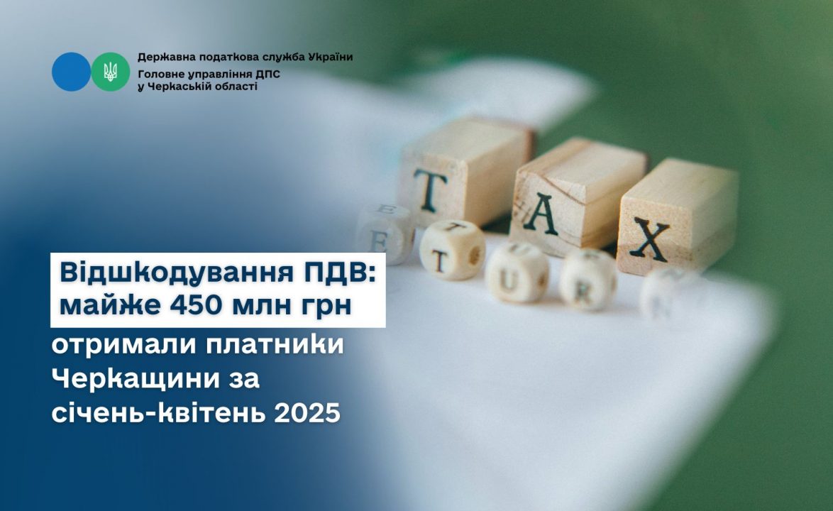 Протягом січня-квітня 2025 року платниками Черкаської області заявлено до відшкодування ПДВ на розрахункові рахунки 450,426 млн грн, що на 29,07 млн грн менше, порівняно з показником за відповідний період минулого року.