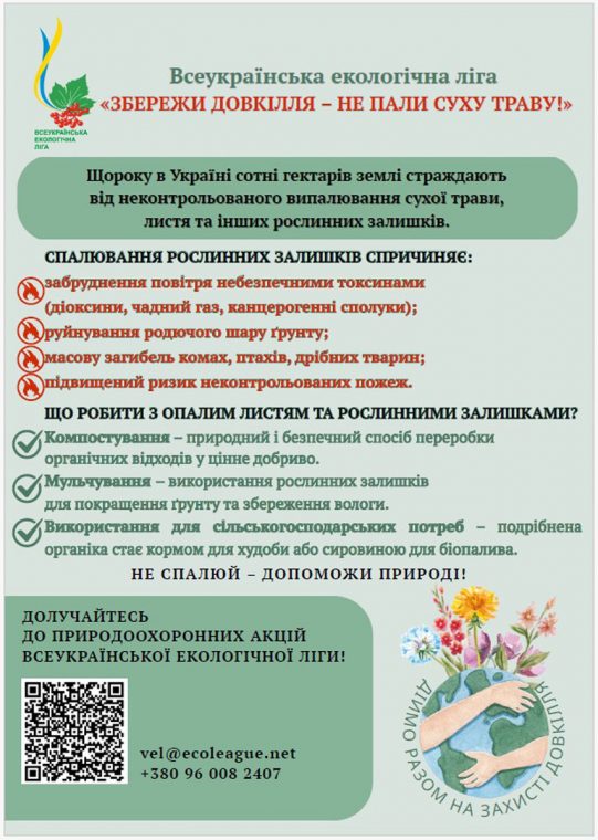 Всеукраїнська екологічна ліга розпочинає всеукраїнську природоохоронну акцію «Збережи довкілля – не пали суху траву». Метою акції є привернення уваги громадськості до небезпеки спалювання сухої трави, листя та інших рослинних залишків, а також популяризація екологічно безпечних способів їх утилізації.