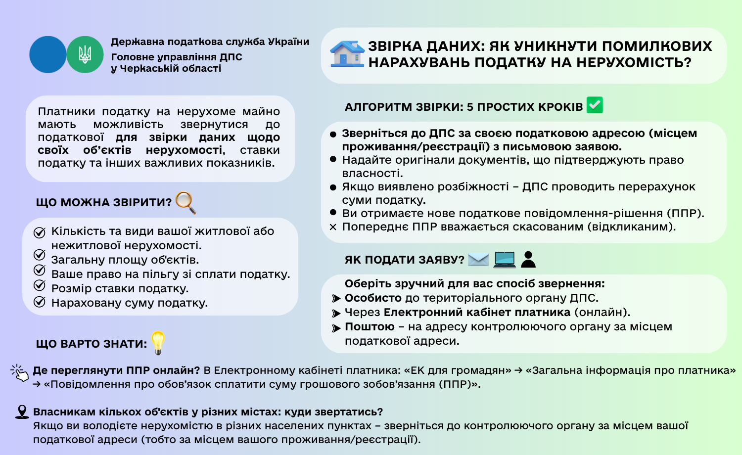 Платники податку на нерухоме майно, відмінне від земельної ділянки, мають право звернутися з письмовою заявою до контролюючого органу для проведення звірки даних (п.п. 266.7.3 ПКУ).
