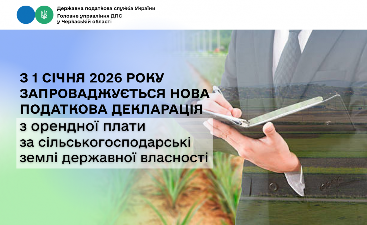 Начальник Головного управління ДПС у Черкаській області, Тетяна Харьковська, нагадує, що з 1 січня 2026 року запроваджується нова форма податкової декларації з орендної плати для земельних ділянок сільськогосподарського призначення державної власності.
