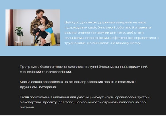 Цей курс допоможе дружинам ветеранів не лише підтримувати своїх близьких і себе, але й отримати важливі знання та навички для того, щоб стати сильнішими, впевненішими й ефективніше справлятися з труднощами, що виникають на їхньому шляху.