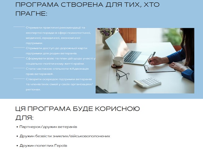 Онлайн програма “Дружина ветерана”, спрямована на зміцнення стійкості сімей ветеранів, формування життєзарадності, економічному та соціальному благополуччю.