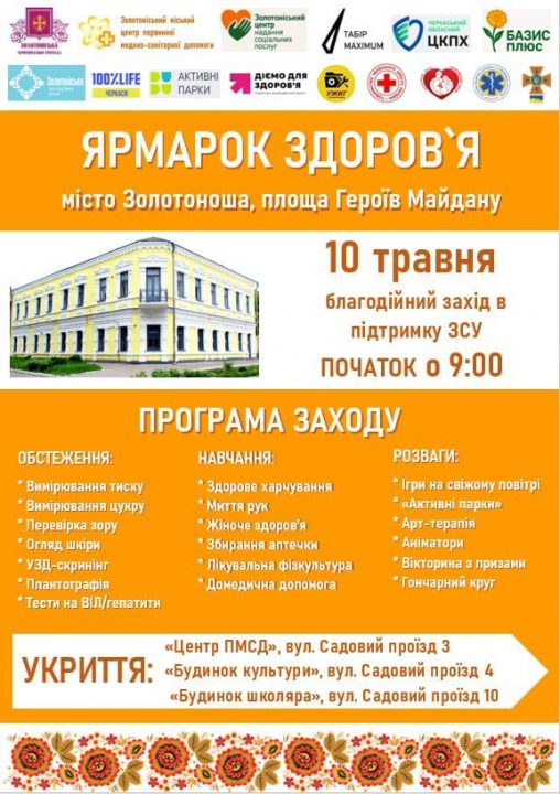 У суботу, 10 травня, в Золотоноші втретє відбудеться Ярмарок Здоров’я. Третій рік поспіль спільнота медиків первинної медико-санітарної допомоги на чолі з директором Олександром Прокопчуком організовує вуличний скринінг для золотонісців. Цьогоріч захід спрямований на дітей. Про деталі майбутнього масштабного заходу повідомляє видання Золотоноша.City.