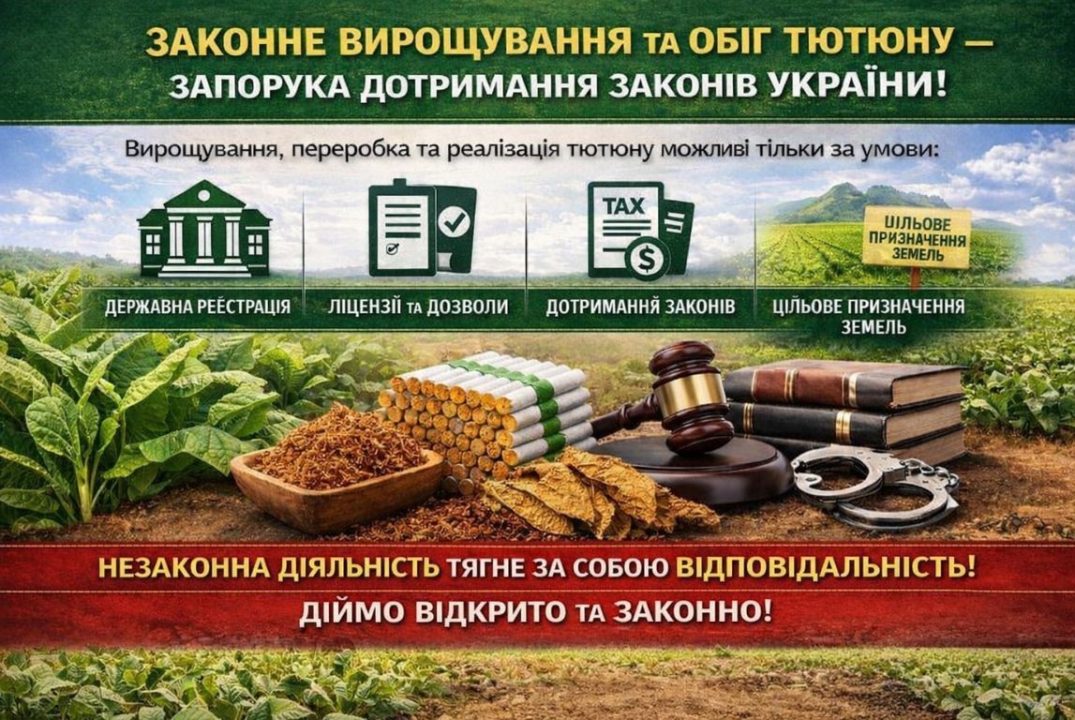 Черкаська обласна військова адміністрація інформує суб’єктів господарювання, землекористувачів та жителів громади про необхідність неухильного дотримання вимог законодавства України у разі здійснення діяльності, пов’язаної з вирощуванням, зберіганням, переробкою та реалізацією тютюну і тютюнової сировини.