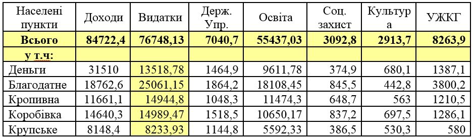 Питома вага галузей в загальному обсязі видатків становить: державне управління – 11,7 %, освіта – 58,0 %, охорона здоров’я – 3,0 %, соціальний захист та соціальне забезпечення – 7,8 %, культура і мистецтво – 3,9 %, фізична культура і спорт – 2,3 %, житлово-комунальне господарство – 8,0 %, економічна діяльність – 3,7 %, інша діяльність – 1,0 %, міжбюджетні трансферти іншим бюджетам – 0,6%.