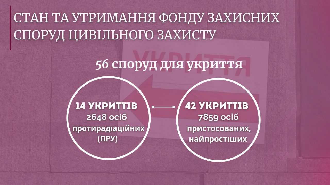 - 42 пристосованих, найпростіших укриттів на 7859 ос.