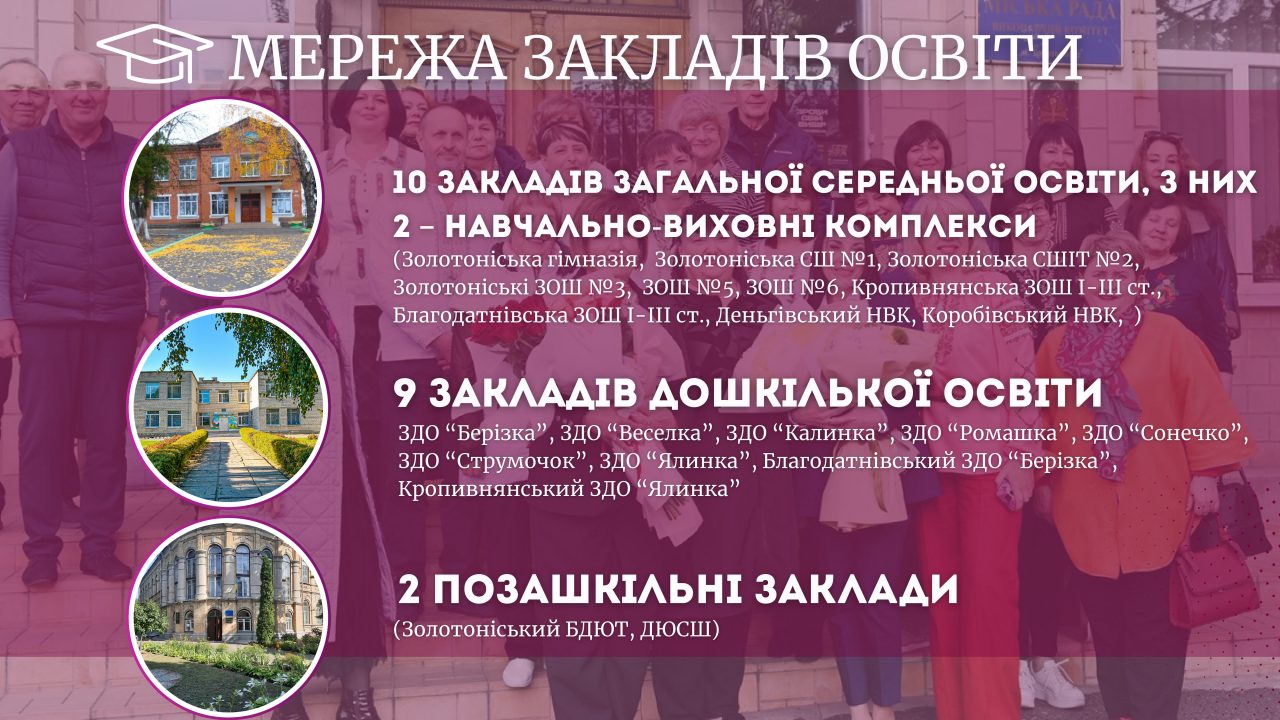 На території Золотоніської ТГ 277 дітей проживає за межею пішохідної доступності, які 100% забезпечені підвезенням до місця навчання та у зворотньому напрямку. Здійснюється перевезення учасників освітнього процесу тереторіальної громади до осередку викладання предмета „Захист України”, який знаходиться на базі Золотоніської загальноосвітньої школи І-ІІІ ступенів №3. Підвезення здійснюється 5 шкільними автобусами.