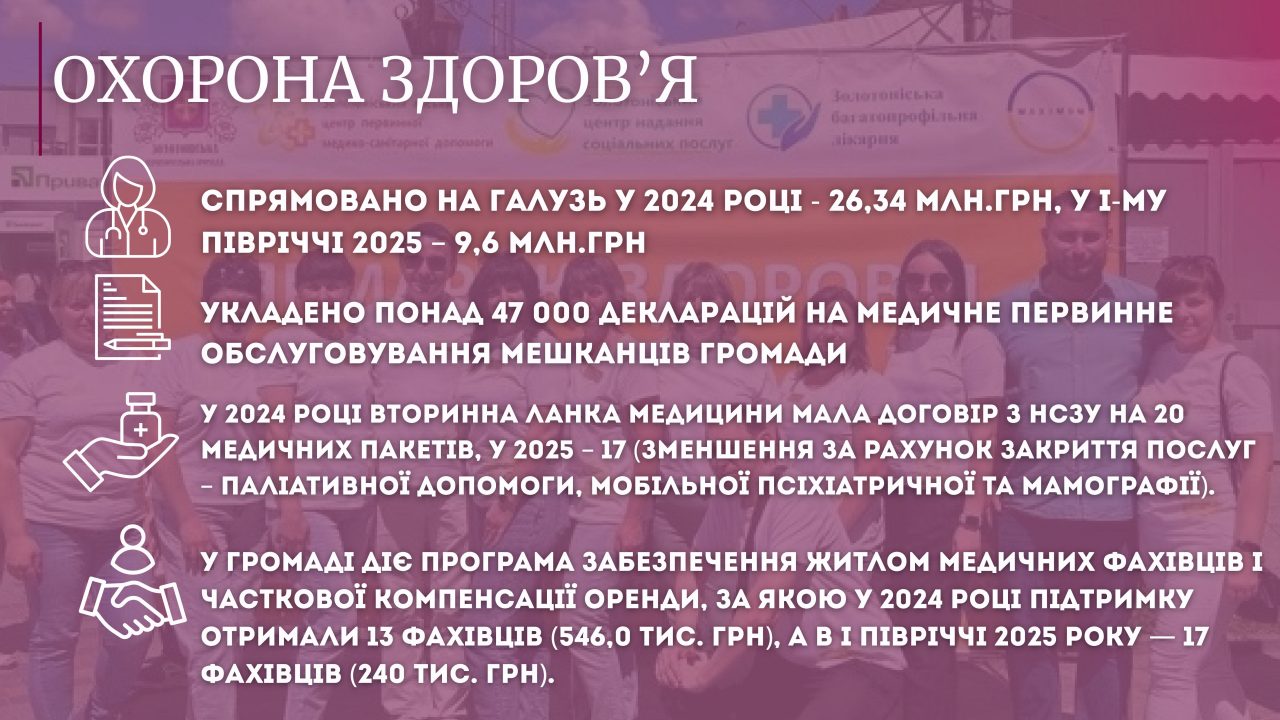 Послуги вторинної ланки медицини надає КНП „Золотоніська багатопрофільна лікарня”. У 2024 році заклад мав договір з НСЗУ на 20 медичних пакетів, у 2025 – 17 (зменшення за рахунок закриття послуг – паліативної допомоги, мобільної псіхіатричної та мамографії). Станом на 01.07.2025 року штатна чисельність працівників по підприємству становить 524,0 штатних одиниць.