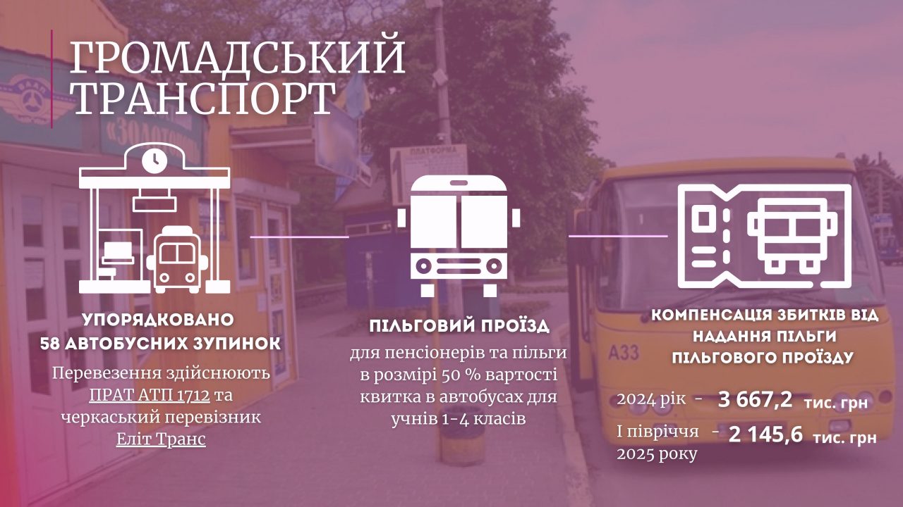 На території громади упорядковано 58 автобусних зупинок. Мережа міських маршрутів залишається стабільною і є необхідність розширення мережі приміського сполучення. Перевезення здійснюють ПРАТ АТП 1712 та черкаський перевізник Еліт транс. У громаді збережено право пільгового проїзду пенсіонерів та пільги в розмірі 50 % вартості квитка в автобусах для учнів 1-4 класів. На компенсацію збитків від надання пільги пільгового проїзду громадян за січень-червень 2025 року з бюджету територіальної громади профінансовано 2 145,586 тис. грн, а у 2024 році – 3667,174 тис. грн.