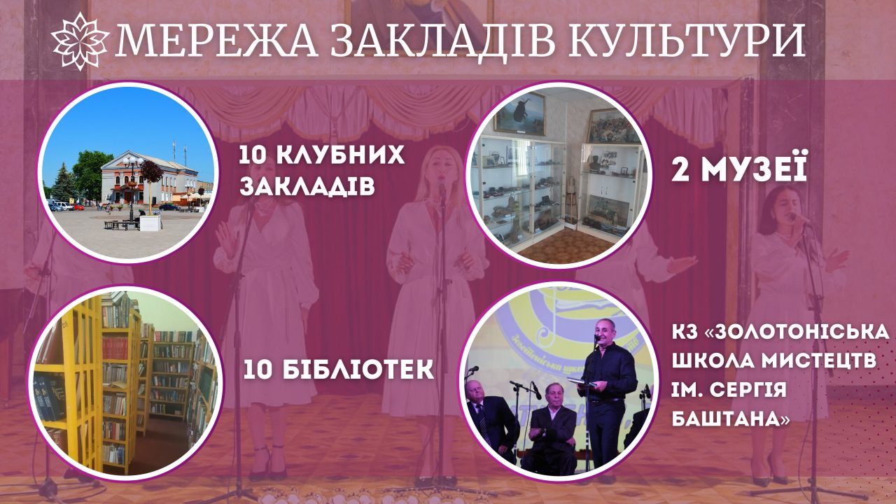 Комунальним закладом „Золотоніська школа мистецтв імені Сергія Баштана” за період січень – червень 2024 рр. проведено 12 заходів, червень 2024 р. – червень 2025 р. – 19 заходів. Учні закладу беруть участь у місцевих, обласних, всеукраїнських та міжнародних конкурсах.