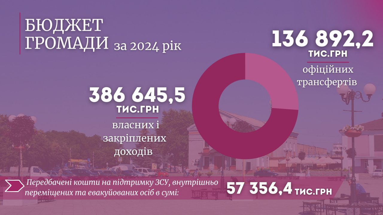 Обсяг надходжень до бюджету громади за 2024 рік склав 523 537,7 тис грн, або 100,2 % до уточненого плану на рік, перевиконання склало 1 064,1 тис грн. Порівняно з 2023 роком надходження збільшились на 6 605,7 тис грн, або 115,0%.