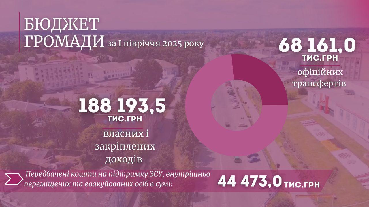 Обсяг надходжень до бюджету громади за І півріччя 2025 року склав 256 354,5 тис грн. В порівнянні з надходженнями за відповідний період 2024 року отримано доходів більше на 33 461,7 тис грн, або 115,0%.