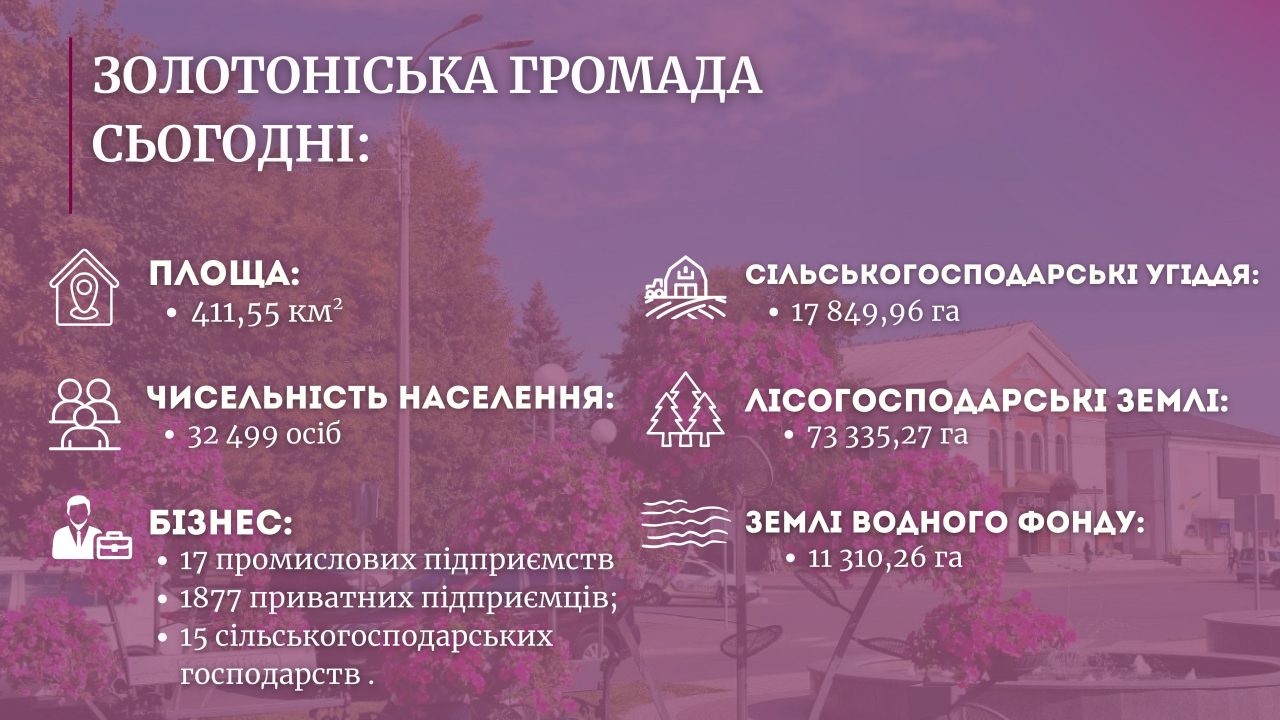 Золотоніська громада складається з 16 населених пунктів, її площа 411,55 . Економічно активне населення складає 56,2% (люди віком від 18 до 60), населення пенсійного віку 33,3%, відповідно діти – 10,5%. В громаді проживає 32 508 осіб і не зважаючи на природній спад, кількість людей збільшується за рахунок прибуття ВПО.