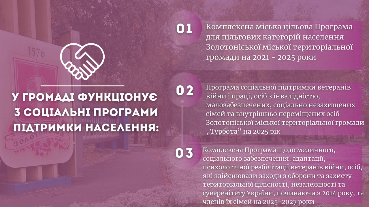 У бюджеті Золотоніської міської територіальної громади передбачені кошти на підтримку Збройних Сил України, в т.ч. сил територіальної оборони Збройних Сил України, внутрішньо переміщених та евакуйованих осіб в сумі 57356,4 тис. грн., 302,9 тис. грн. – Програма підтримки внутрішньо переміщених та/або евакуйованих осіб, що тимчасово проживають на території Золотоніської територіальної громади, 1720,9 тис. грн. по Програмі соціальної підтримки ветеранів війни і праці, осіб з інвалідністю, учасників антитерористичної операції, учасників операції Об’єднаних сил, малозабезпечених та соціально незахищених сімей Золотоніської міської територіальної громади „Турбота” на 2024 рік, 1015,0 тис. грн. – Програма функціонування та розвитку системи цивільного захисту, забезпечення пожежної та техногенної безпеки Золотоніської територіальної громади на 2021-2025 роки, 2697,1 тис. грн. – харчування дітей військовослужбовців у закладах освіти, 10796,5 – реабілітаційне відділення для військових, 11578,7 тис. грн. – капітальний ремонт укриття та 1100,0 тис. грн. – субвенція на відновлення житлових будинків Смілянської МТГ.